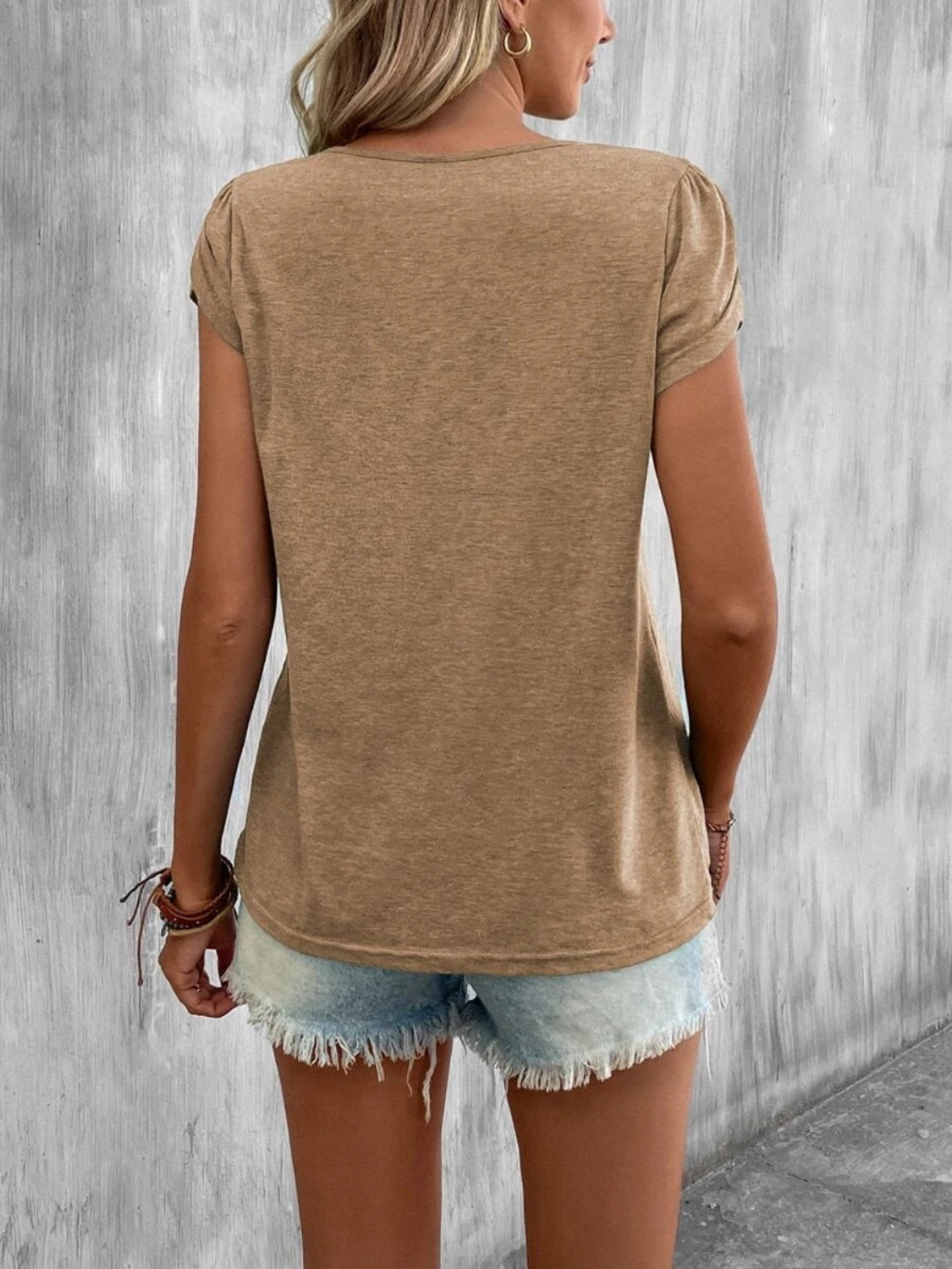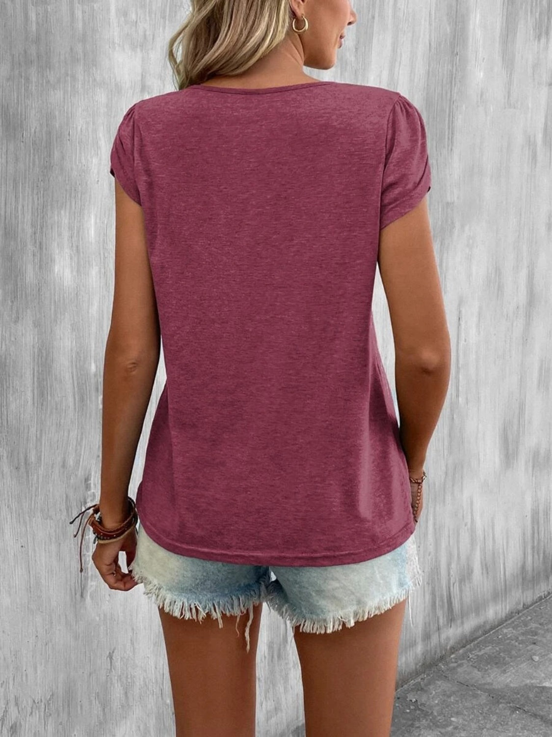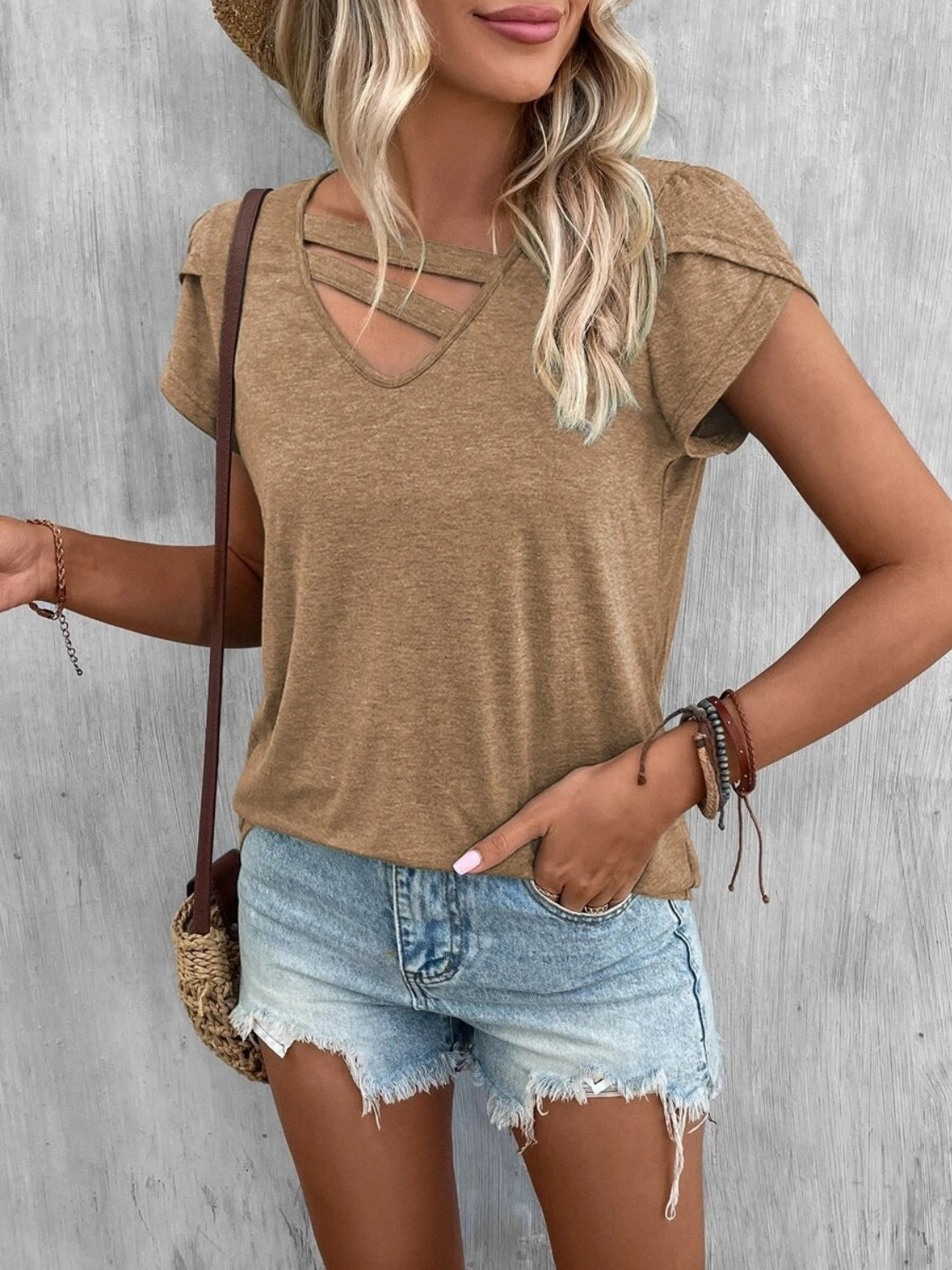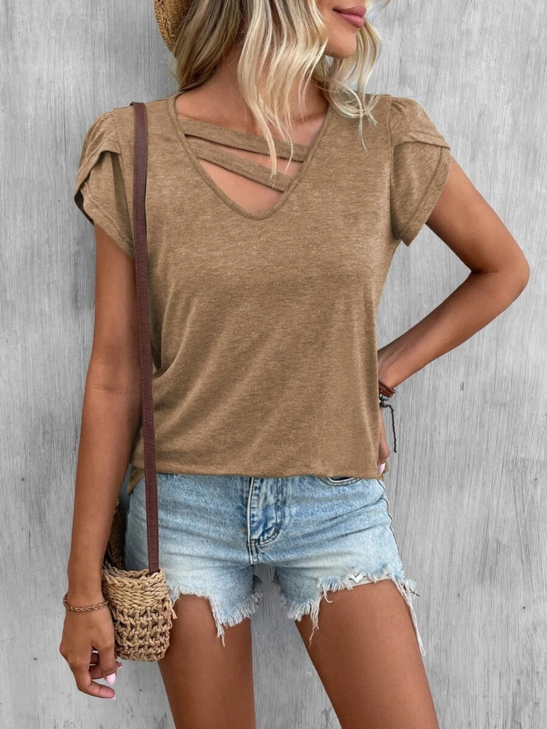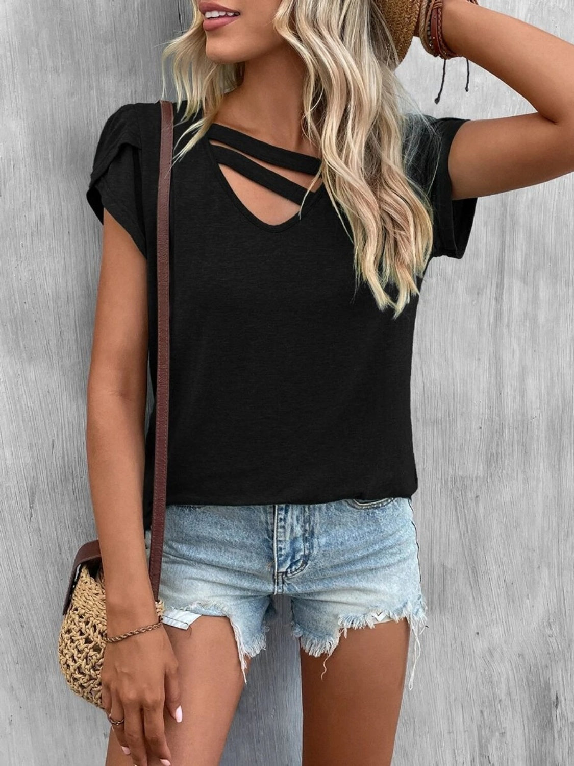 Questa t-shirt con scollo a V e dettagli incrociati è perfetta per aggiungere un tocco trendy anche ai look più semplici.