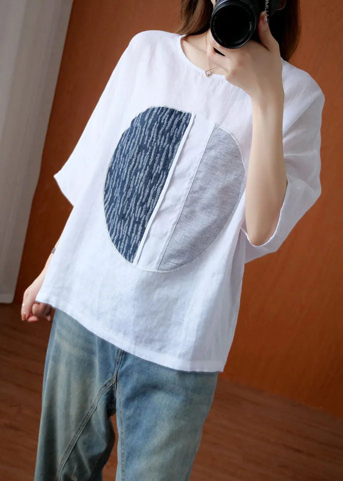 Questa t-shirt in lino con stampa geometrica dona un tocco artistico e moderno al tuo stile quotidiano.