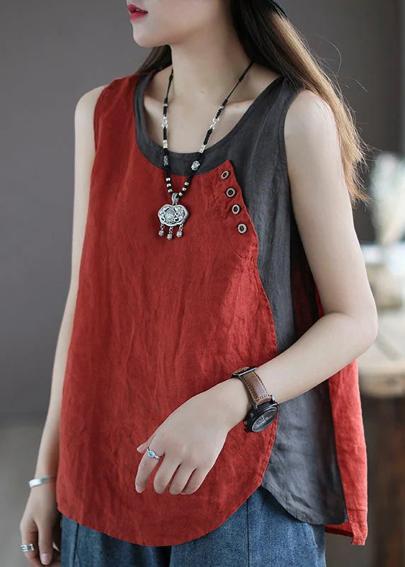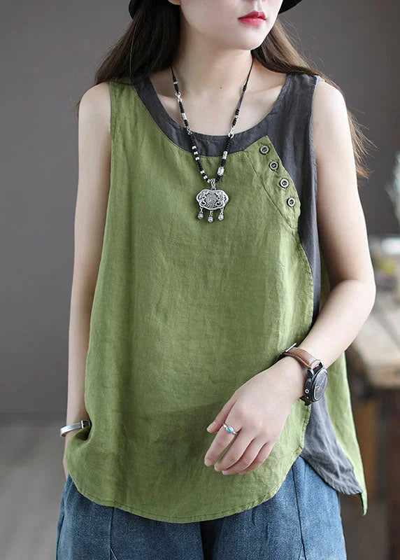 Questo top senza maniche dallo stile boho combina design asimmetrico e dettagli a contrasto per un look casual ma ricercato.