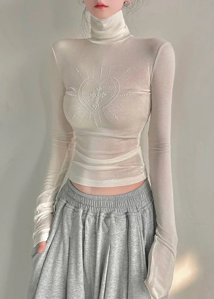Questo top bianco a collo alto con dettagli di strass a cuore aggiunge un tocco speciale al tuo outfit.