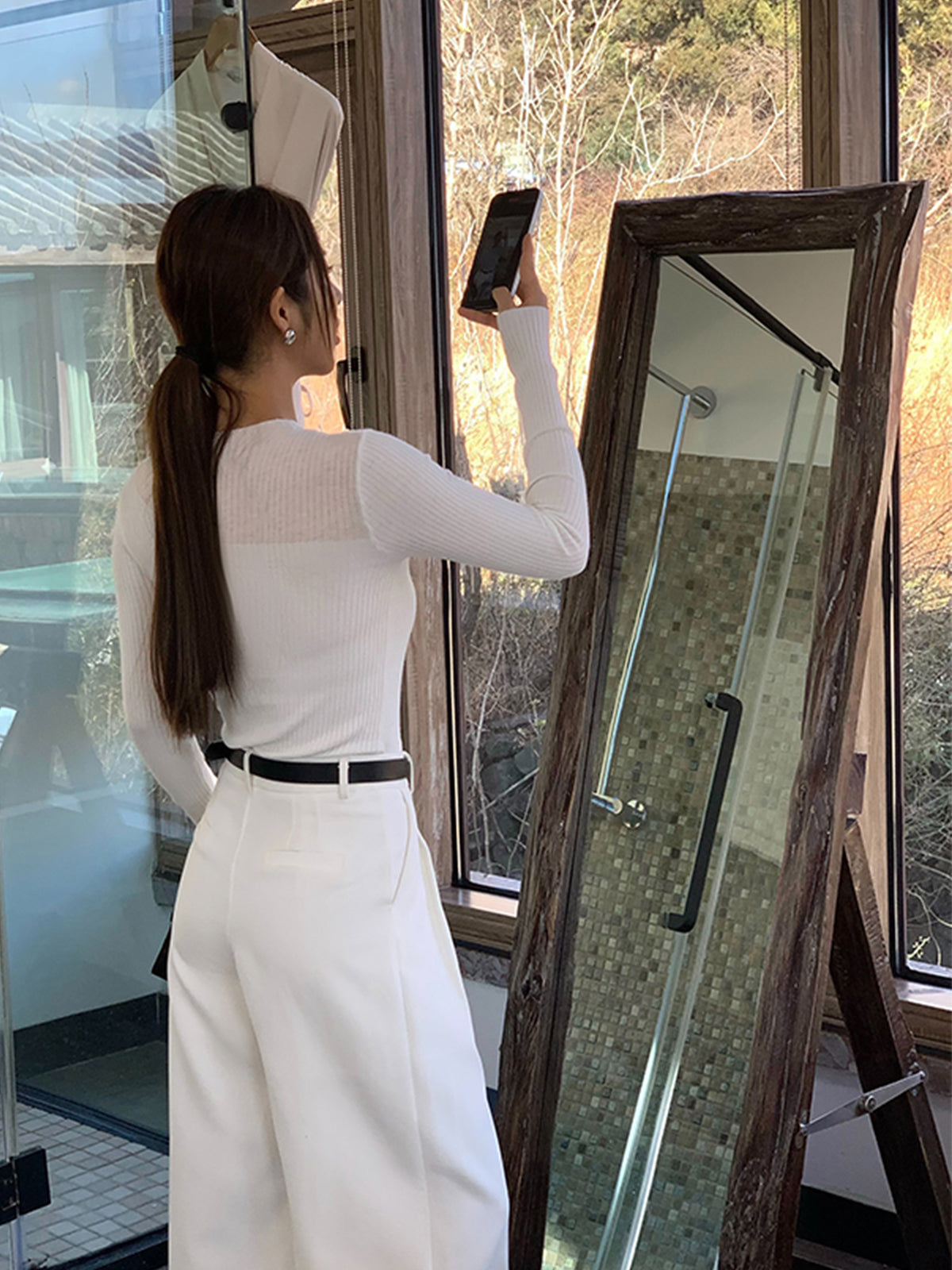 Questo top a maniche lunghe con dettagli trasparenti è perfetto per chi ama la semplicità con un tocco sofisticato. La vestibilità aderente esalta la silhouette, mentre il tessuto leggermente elasticizzato garantisce comfort e stile. Il design con scollo voga e inserti trasparenti lo rende ideale per outfit eleganti e moderni.