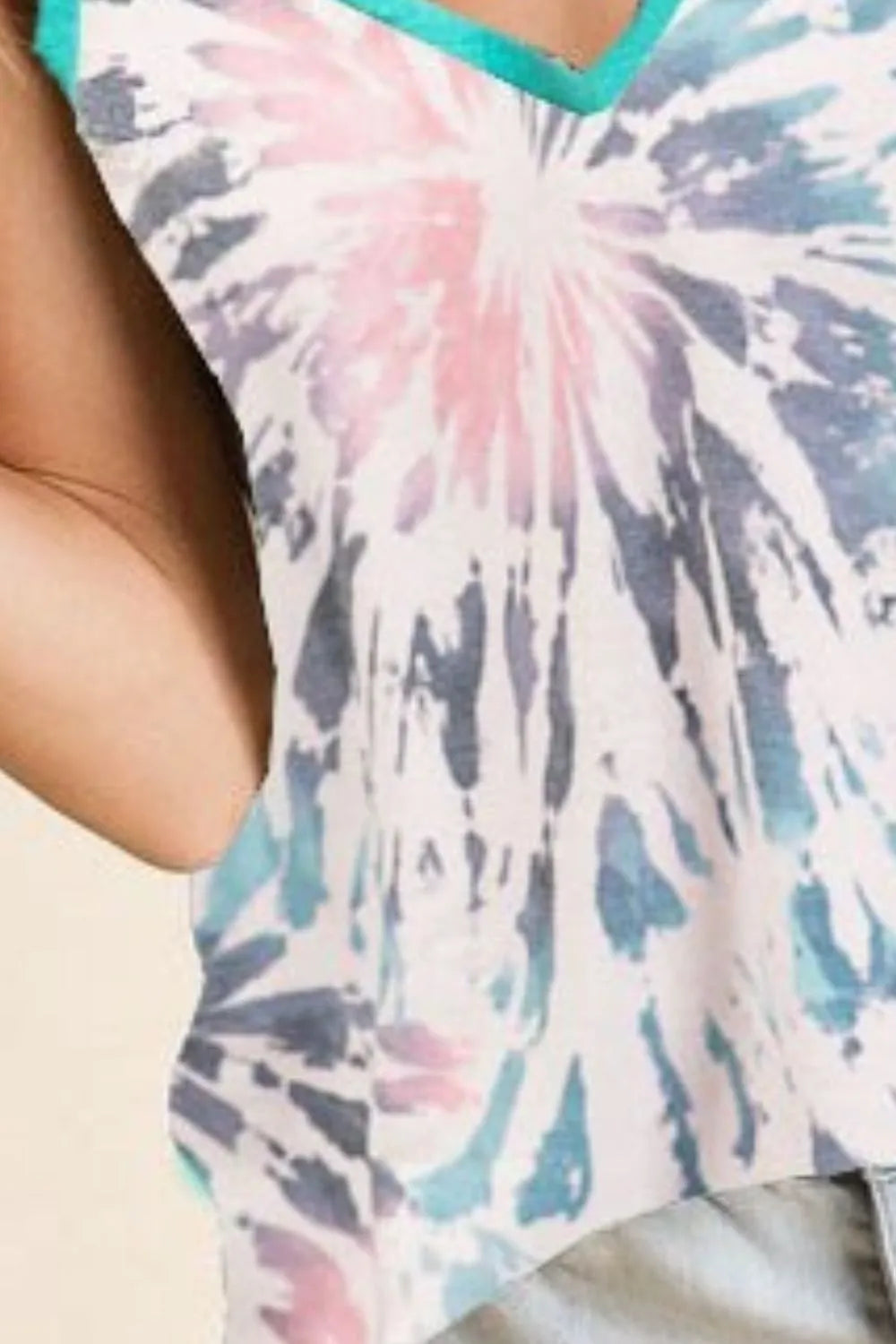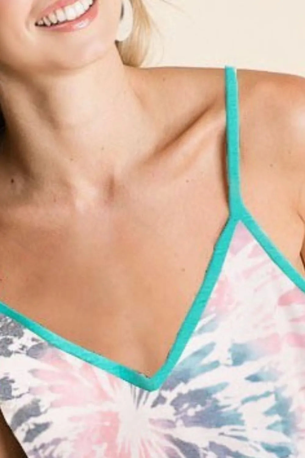 Questo top a spalline sottili con fantasia tie-dye è perfetto per aggiungere un tocco di colore e freschezza al tuo look estivo.