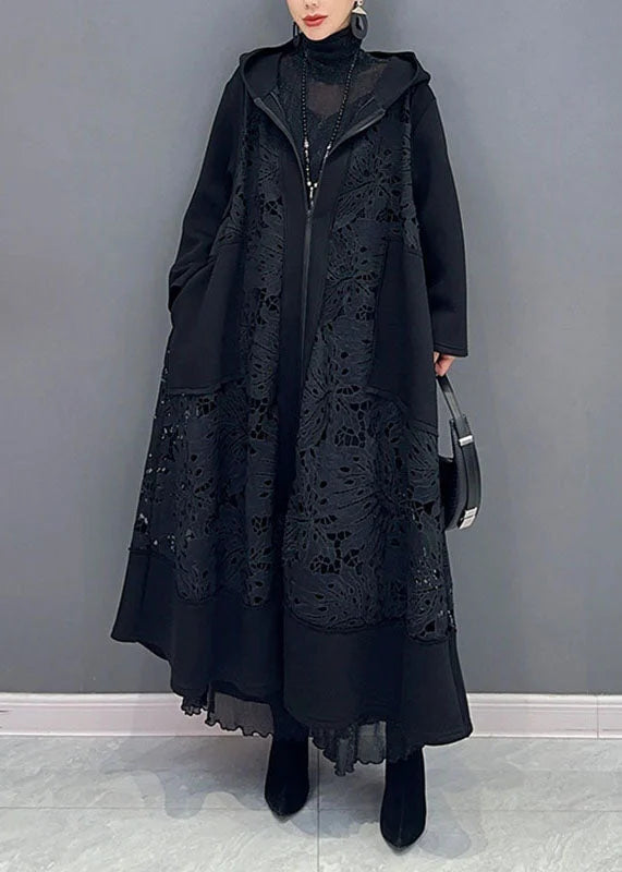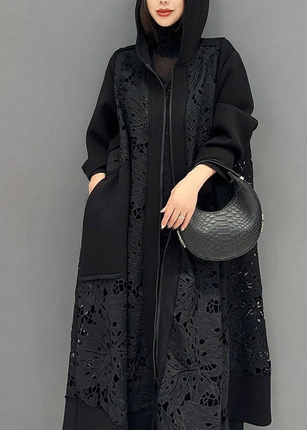 Questo cappotto lungo con inserti in pizzo ricamato unisce raffinatezza e originalità.
