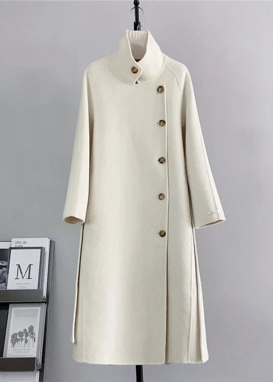 Questo cappotto crema con bottoni laterali unisce raffinatezza e praticità grazie al suo taglio dritto e collo alto.