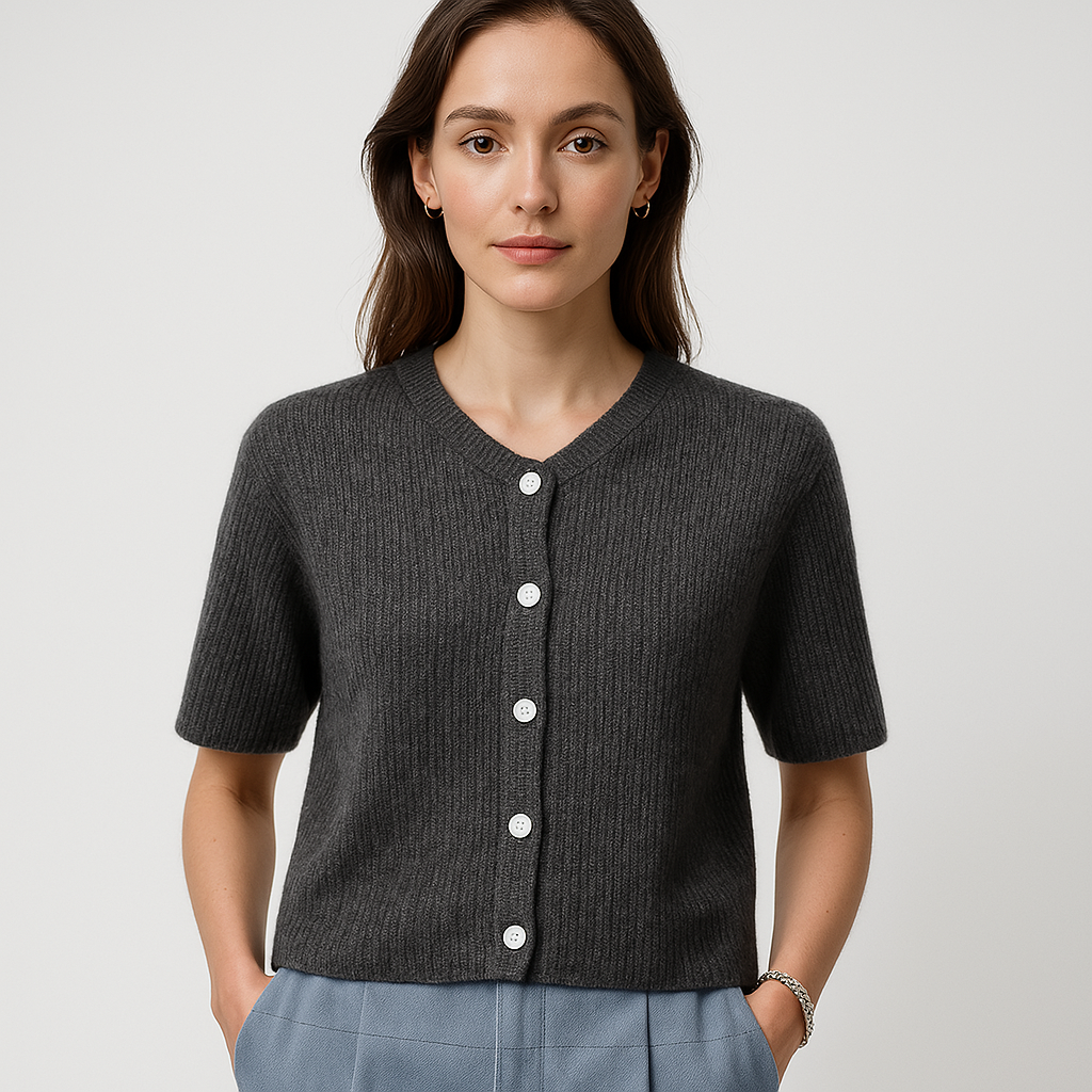 Questo cardigan a maniche corte in maglia a costine è la scelta ideale per un look fresco ma elegante.