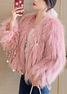 Questa giacca in pelliccia sintetica rosa con dettagli di perline pendenti è perfetta per un look glamour e audace.