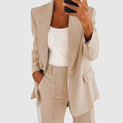 Questo tailleur con giacca lunga e pantaloni dritti offre un’eleganza sobria e una linea impeccabile.