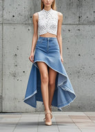Questa gonna in denim con orlo asimmetrico unisce stile casual e dettagli trendy.