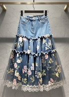 Questa gonna combina il denim casual con strati di tulle floreale per un look originale e super femminile.