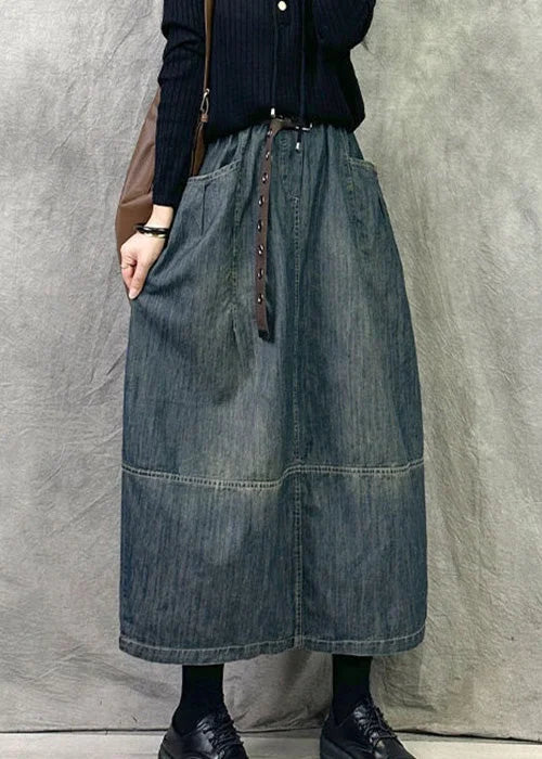 Questa gonna lunga in jeans dal taglio dritto con cintura e grandi tasche abbina praticità e stile casual.
