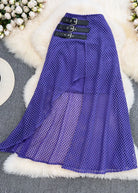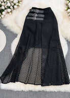 Questa gonna lunga in rete nera con dettagli a fibbie è la scelta perfetta per uno stile deciso e contemporaneo.