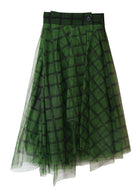 Questa gonna lunga in tulle verde con motivo a quadri è perfetta per chi ama unire femminilità e stile contemporaneo.