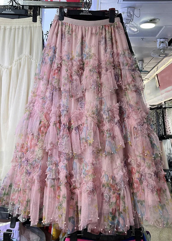 Questa gonna lunga in tulle è arricchita da balze floreali e piccoli dettagli delicati che la rendono unica.