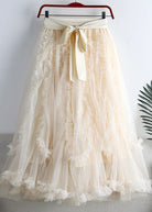 Questa gonna lunga in tulle con balze e cintura a fiocco unisce eleganza e femminilità, perfetta per cerimonie e look raffinati.