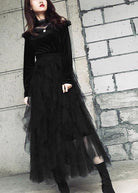 Questa gonna lunga in tulle nero è un capo romantico e di grande impatto, perfetto per creare look sofisticati.