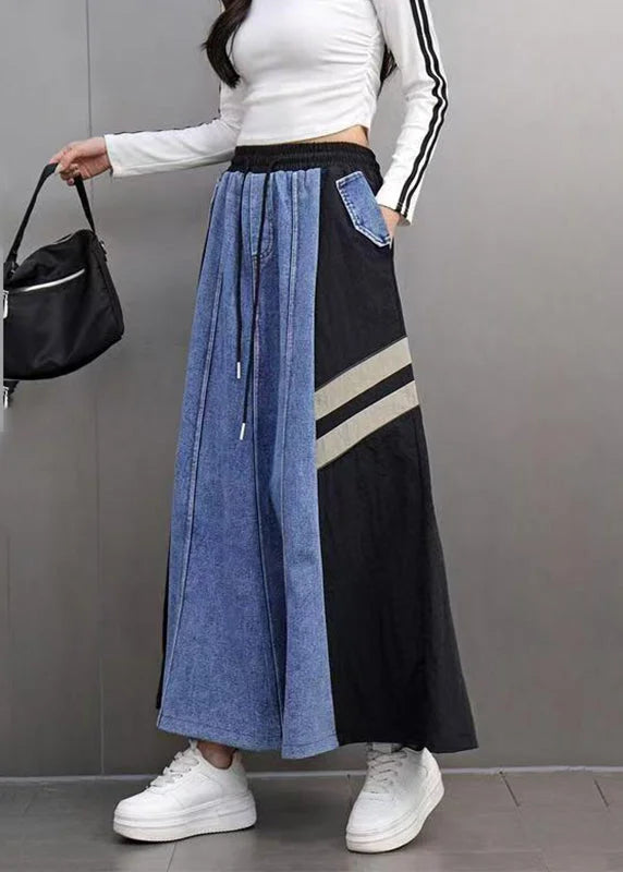 Questa gonna patchwork con inserti in denim e dettagli sportivi aggiunge personalità al tuo outfit quotidiano.
