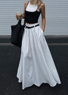 Questa gonna lunga in tessuto lucido con pieghe ampie dona un effetto sofisticato e leggero ad ogni passo.