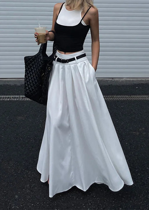 • Design: Gonna lunga a pieghe con finitura satinata e taglio a ruota