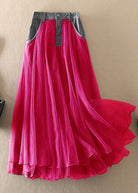 Questa gonna lunga unisce l'eleganza del tulle fluido a una vita strutturata effetto denim per un contrasto sorprendente.
