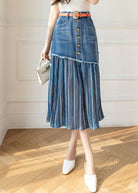 Questa gonna midi combina il fascino del denim con la leggerezza del tessuto plissettato a righe.
