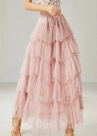 Questa gonna lunga in tulle rosa con balze a strati e perline applicate è la scelta perfetta per un look femminile e incantevole.