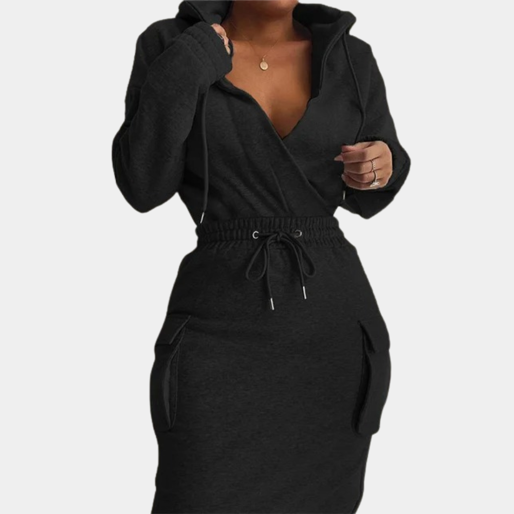 Questo abito con cappuccio e scollo a V è perfetto per un look casual ma femminile, ideale per ogni occasione.
