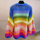 Questo cardigan oversize fatto a maglia con motivo arcobaleno è perfetto per chi ama distinguersi con stile.