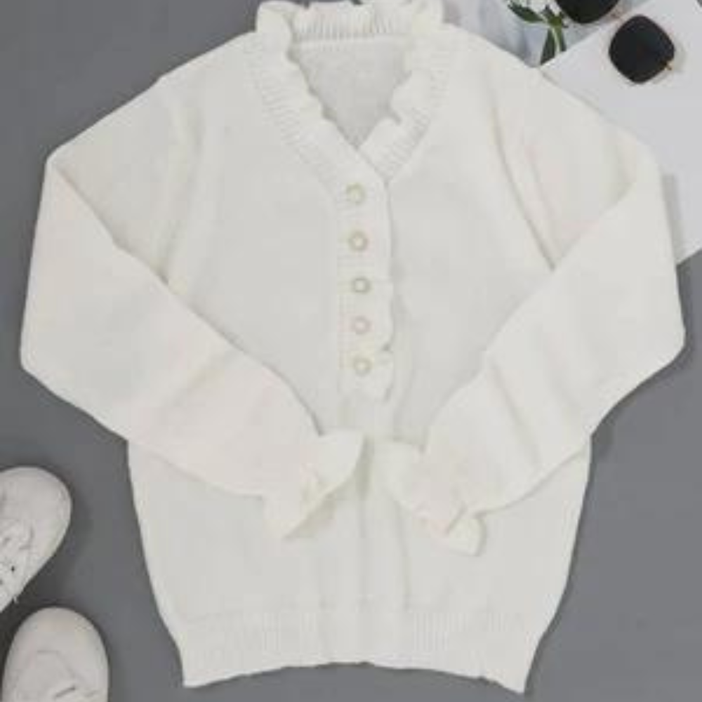 Questo cardigan in maglia con dettagli a balze e bottoni decorativi è perfetto per un tocco romantico e sofisticato.