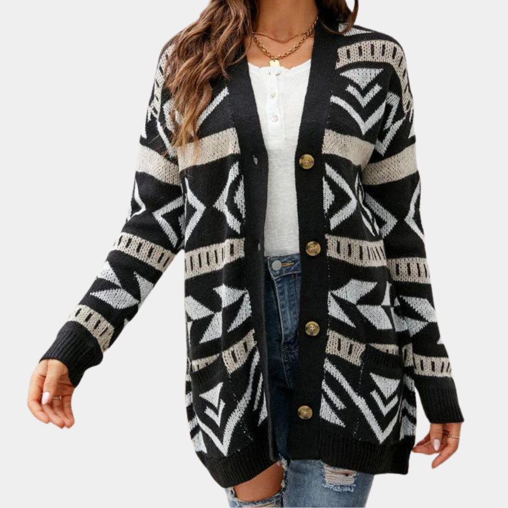 Questo cardigan oversize con motivo geometrico è perfetto per un look casual ma raffinato.