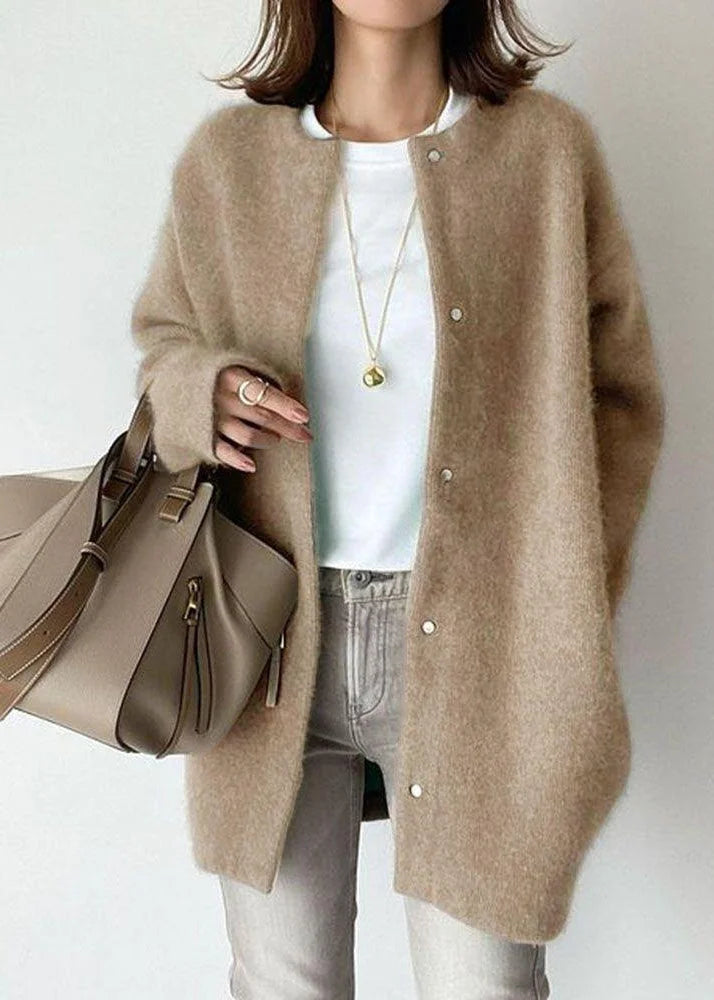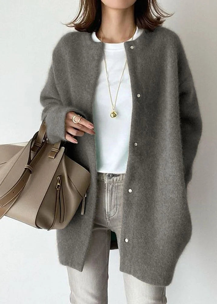 Questo cardigan lungo e leggermente oversize è la scelta perfetta per un look elegante e rilassato.