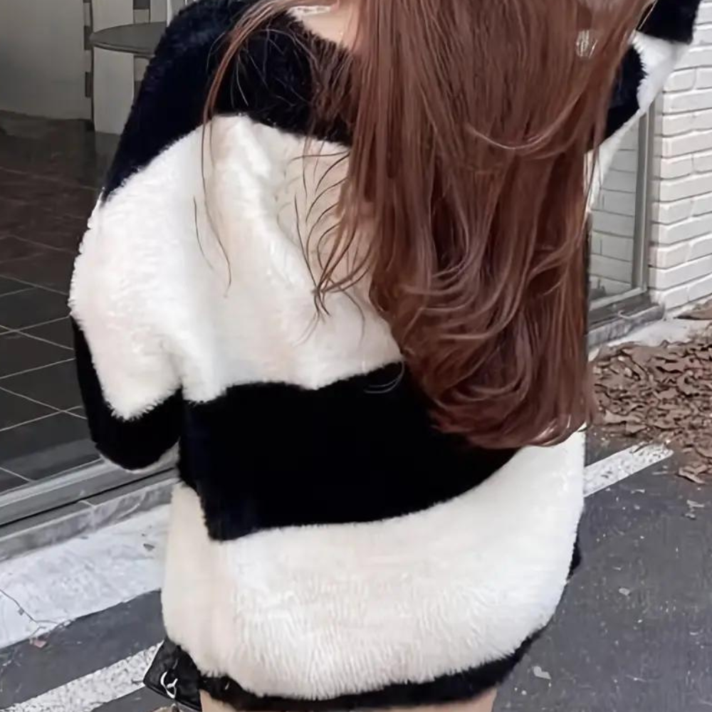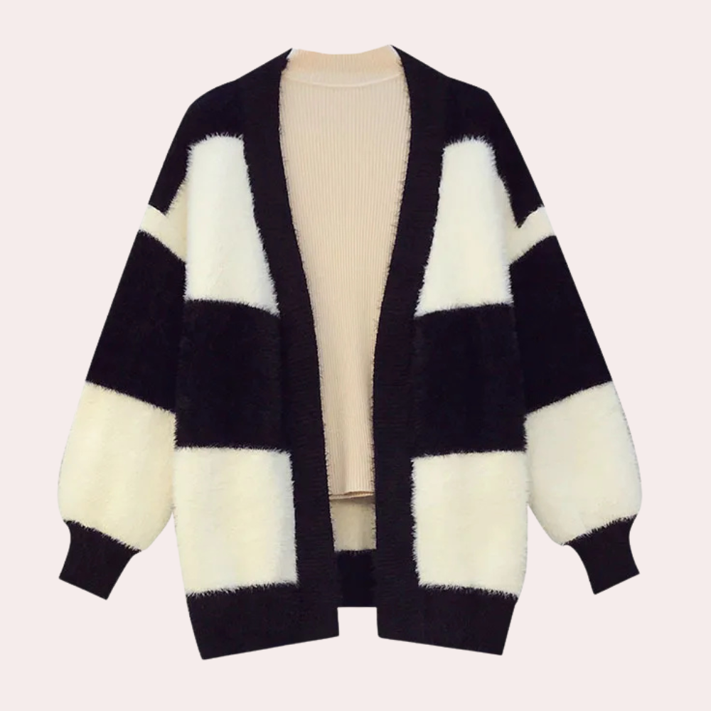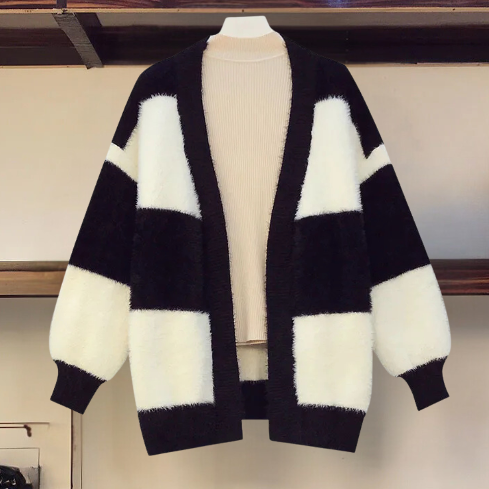 Questo cardigan oversize a righe in tessuto effetto peluche è perfetto per chi ama comfort e stile.