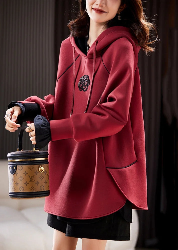 Questa felpa oversize bordeaux con dettagli neri e ricamo centrale dona un tocco raffinato a un capo sportivo.