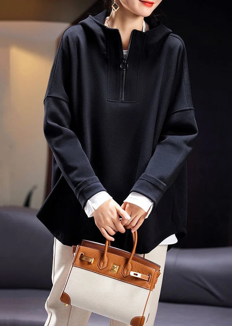 Questa felpa nera con zip frontale e taglio oversize è la soluzione perfetta per un look minimal ma curato.