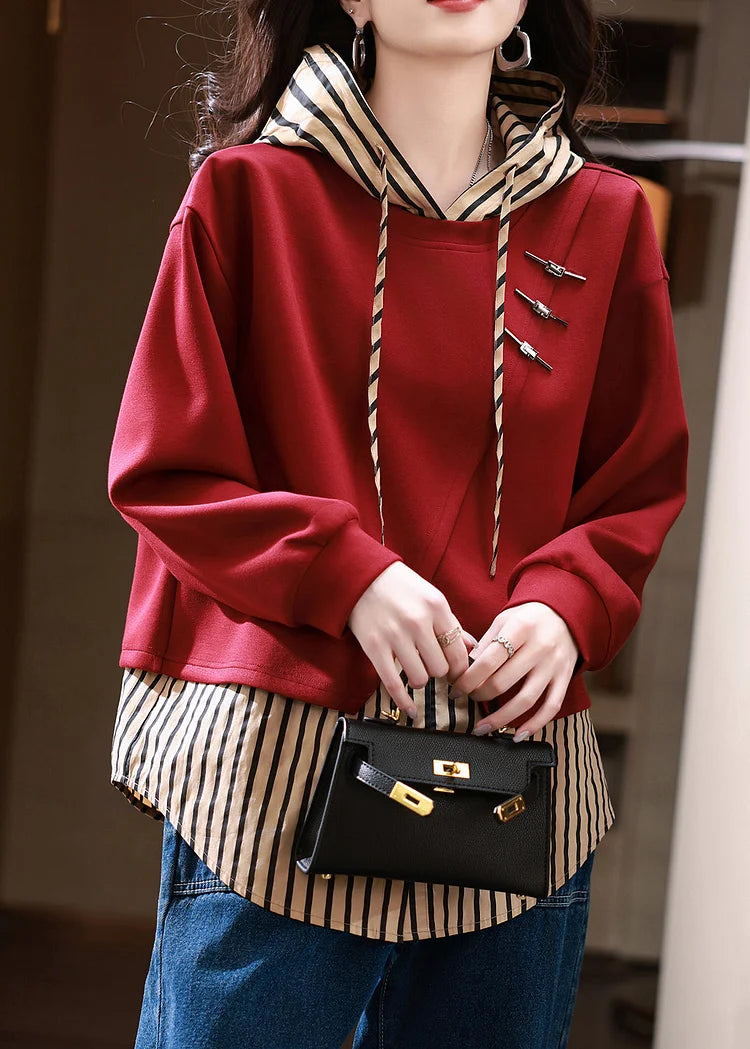 Questa felpa rossa con dettagli a righe dona carattere e originalità al tuo outfit quotidiano.
