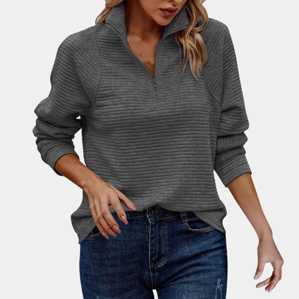 Questo maglione a coste con colletto e zip è perfetto per un look comodo e alla moda.