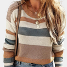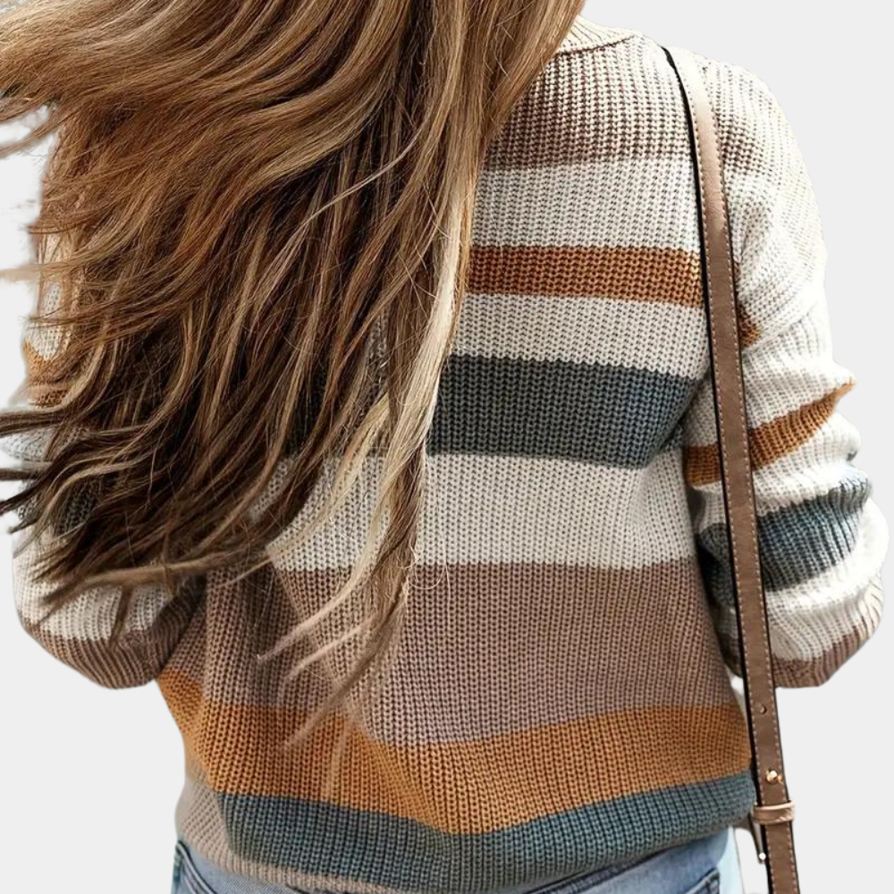 Questo maglione a righe con tonalità neutre e calde è perfetto per un look casual e raffinato.