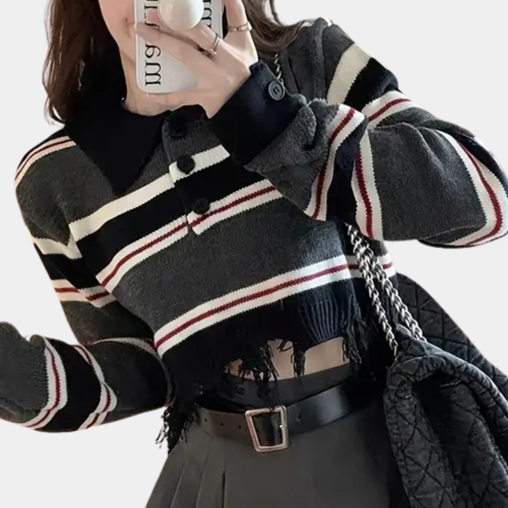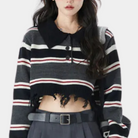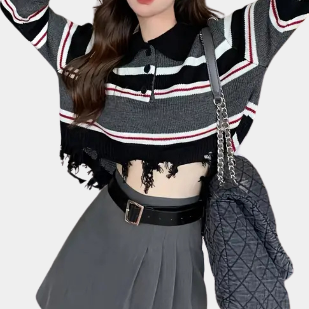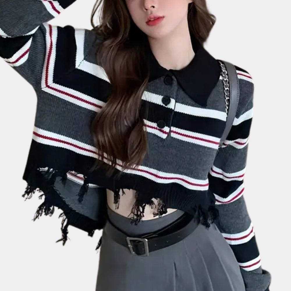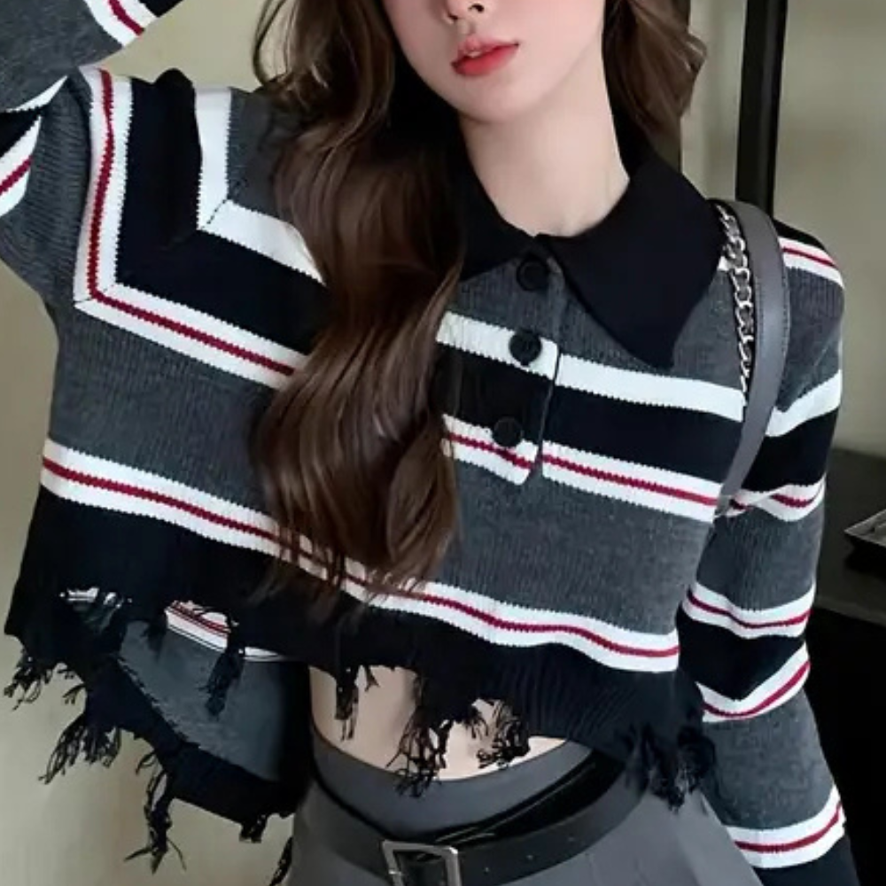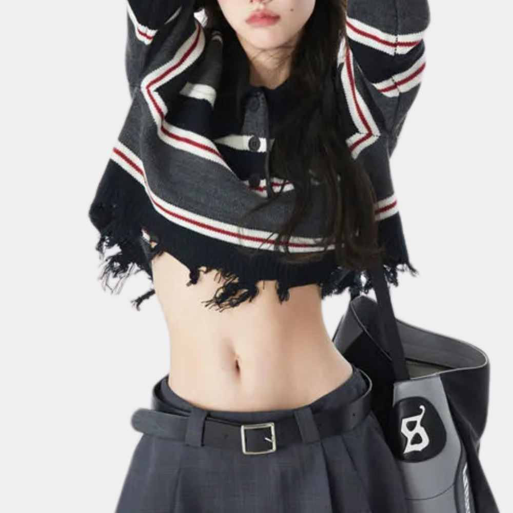 Questo maglione cropped a righe con orlo sfrangiato è perfetto per chi ama uno stile urban e grintoso.
