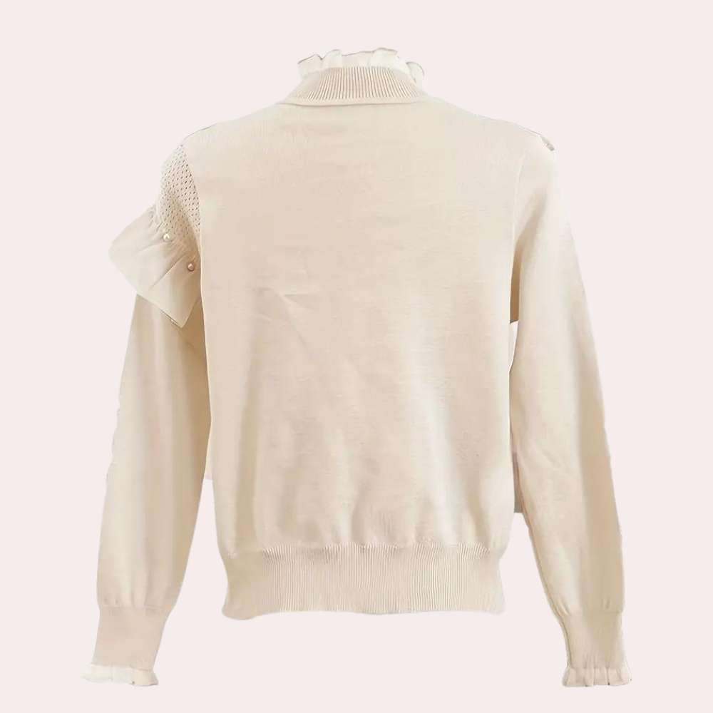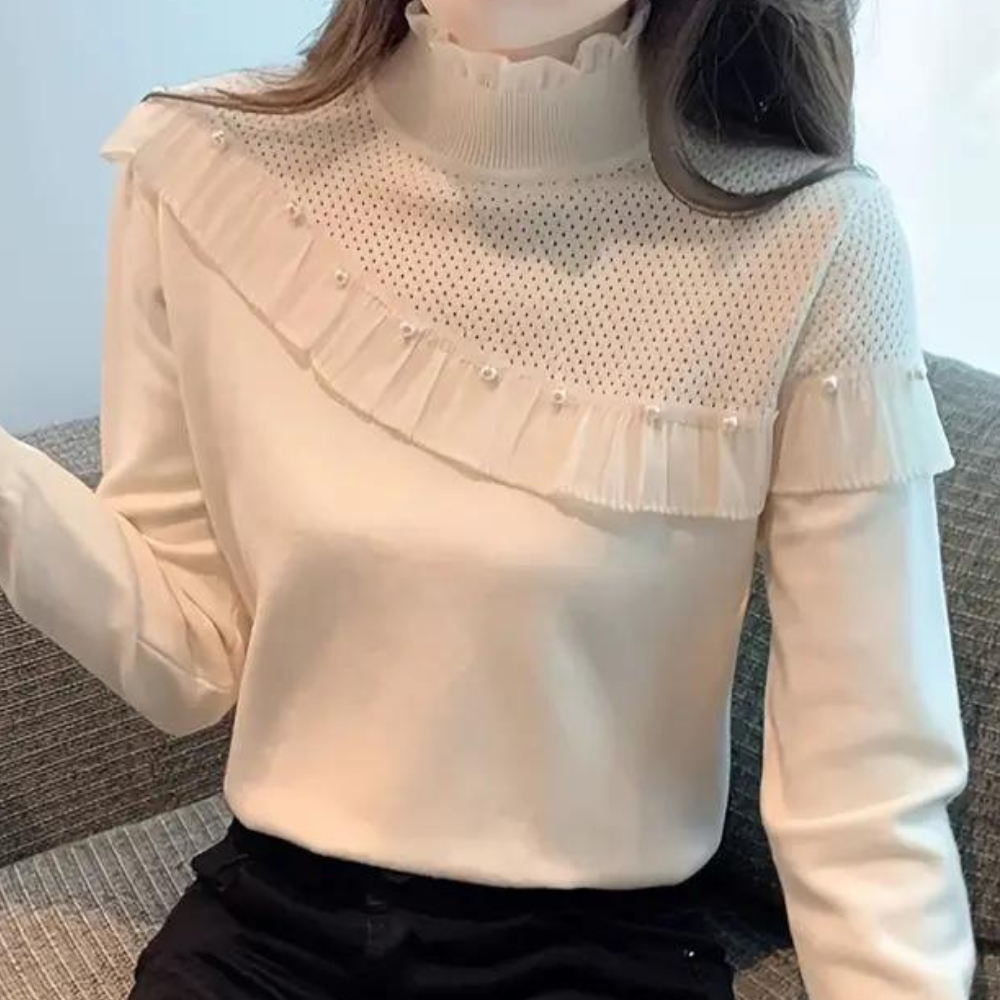 Questo maglione dolcevita con ruches e perle decorative è perfetto per un look romantico ed elegante.