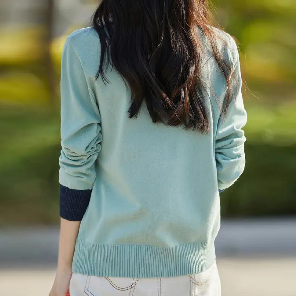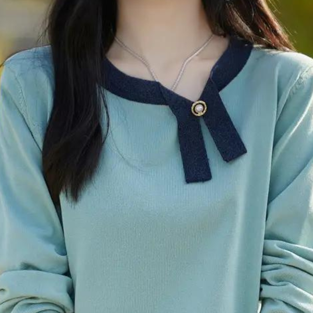 Questo maglione con fiocco decorativo e dettagli a contrasto è perfetto per un look femminile e sofisticato.