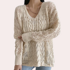 Questo maglione in maglia traforata con scollo a V è perfetto per chi ama lo stile boho-chic.