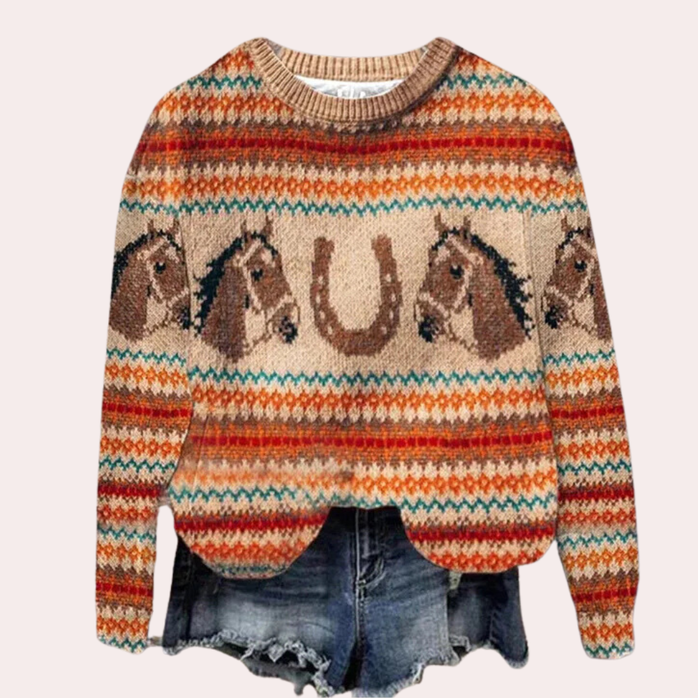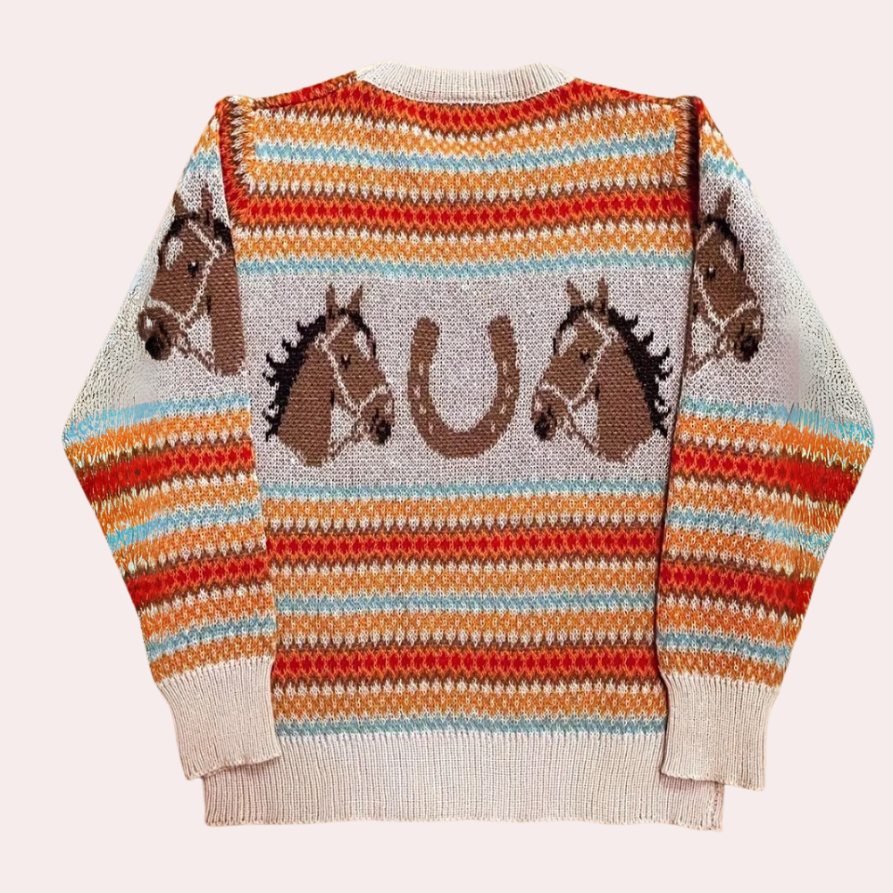 Questo maglione a tema western con dettagli di cavalli e ferro di cavallo è perfetto per un look cozy e vintage.
