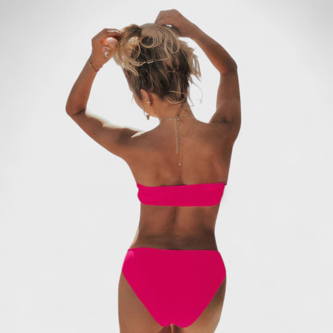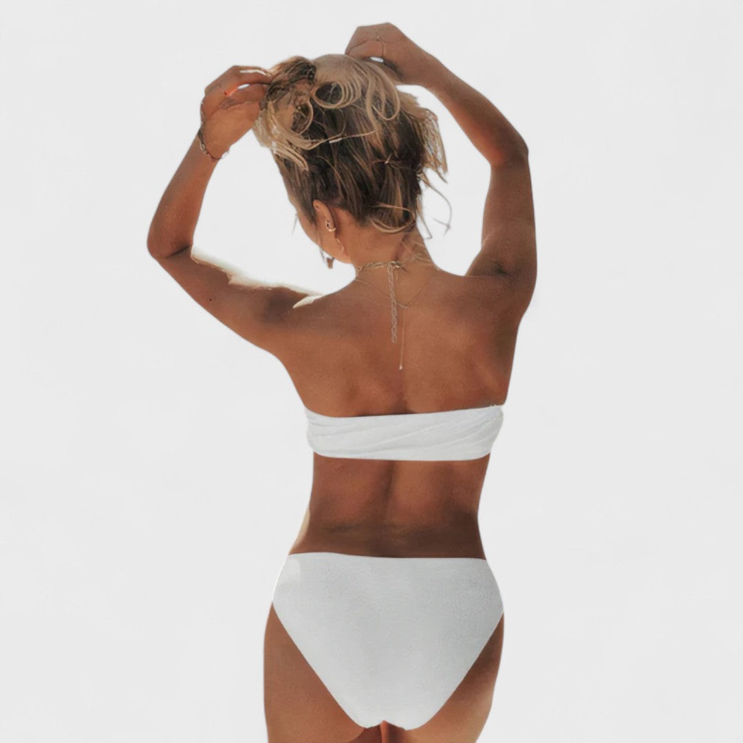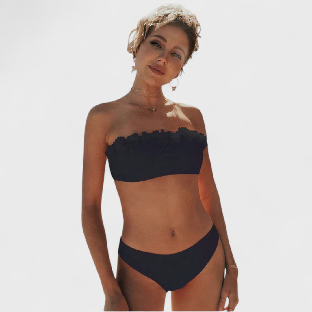 Il design senza spalline esalta la silhouette e garantisce comfort e stile anche sotto il sole.