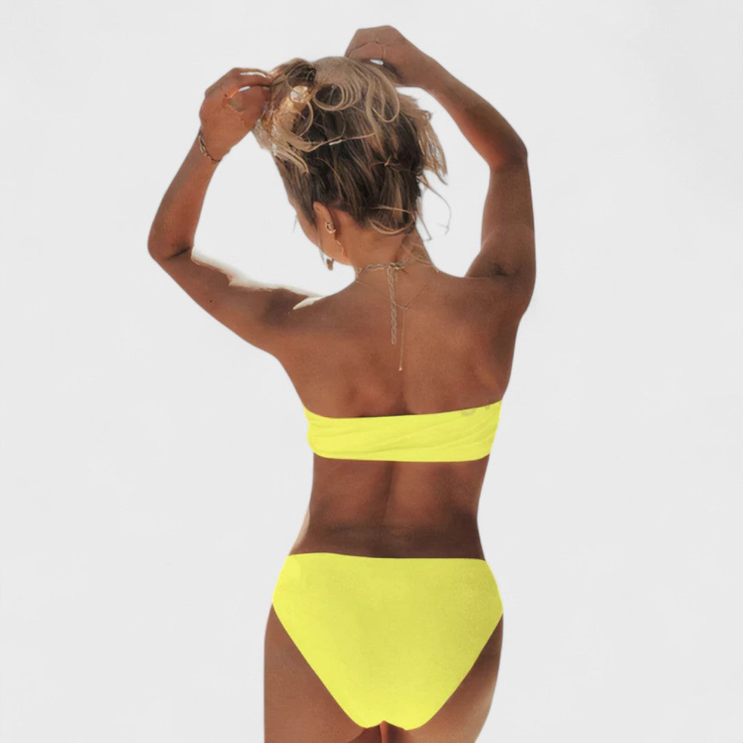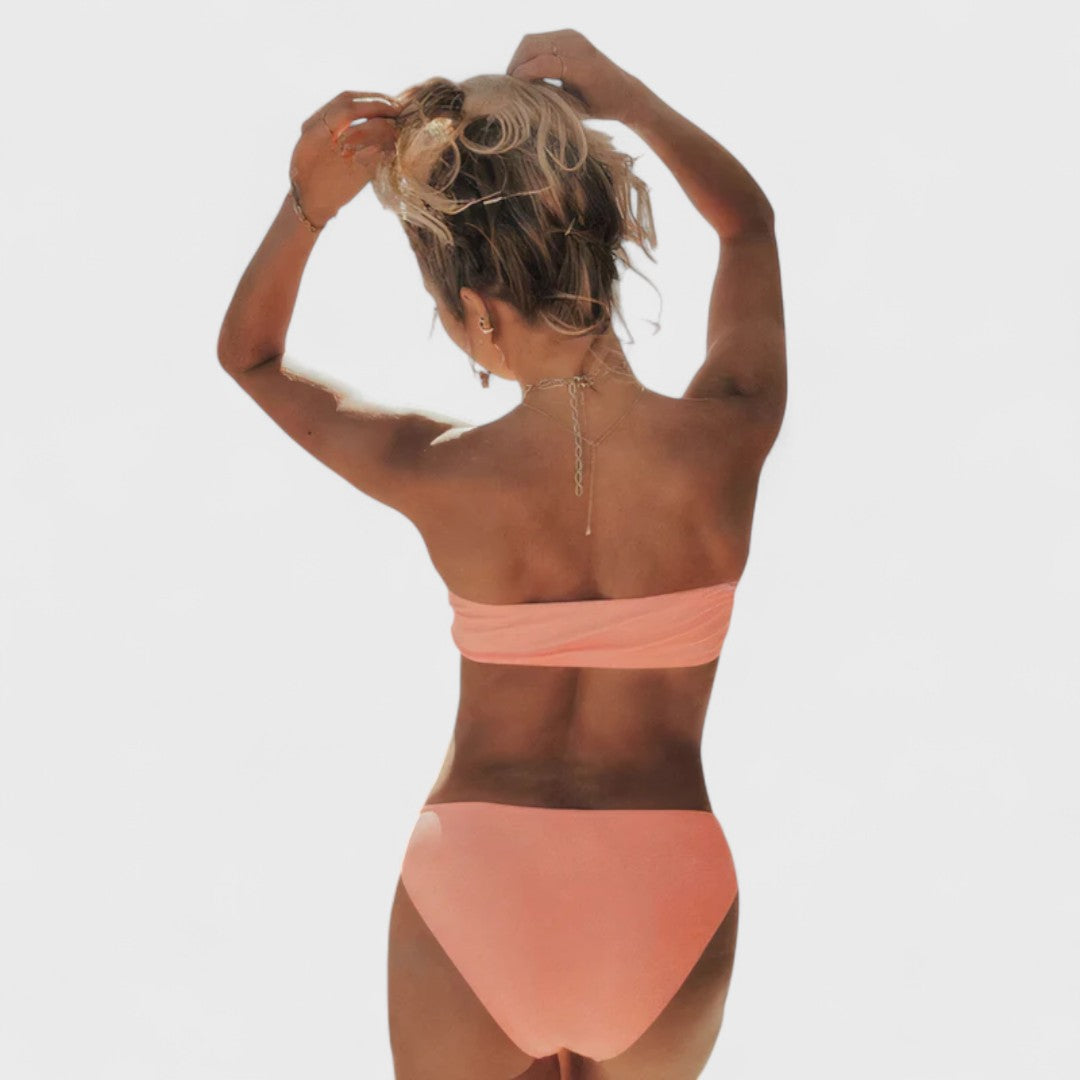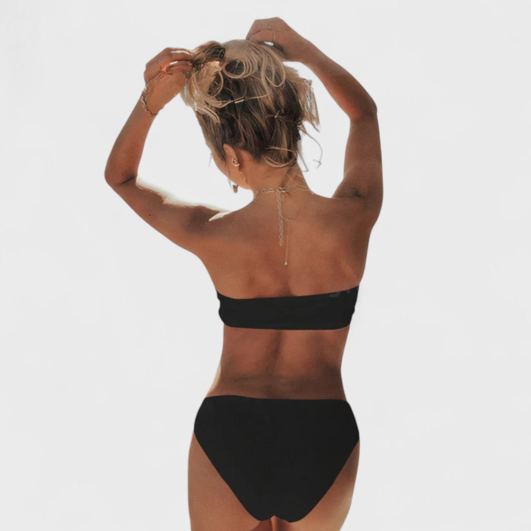 Il design senza spalline esalta la silhouette e garantisce comfort e stile anche sotto il sole.