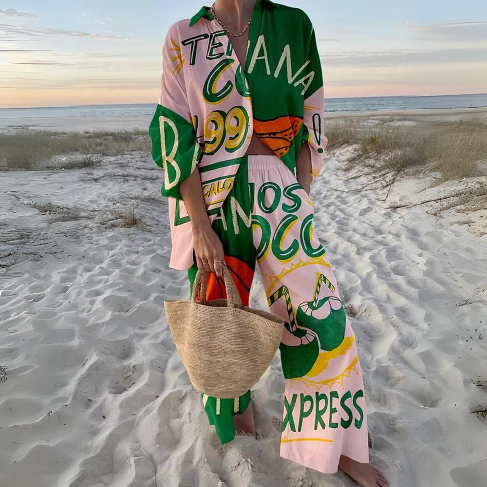 Questo completo due pezzi è la definizione di stile vacanziero rilassato con un tocco artistico. La camicia oversize con stampa grafica colorata si abbina perfettamente al pantalone palazzo, creando un look audace ma elegante.