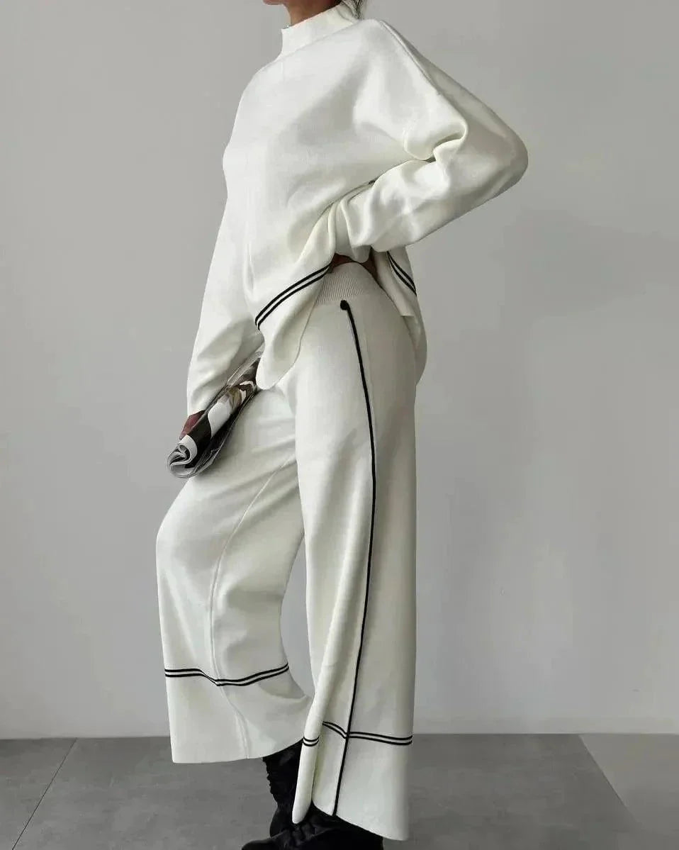 Cet ensemble deux pièces blanc cassé au design épuré est la définition du chic minimaliste, alliant confort absolu et style affirmé. Avec ses lignes contrastantes et sa coupe ample, il offre un look structuré sans effort.