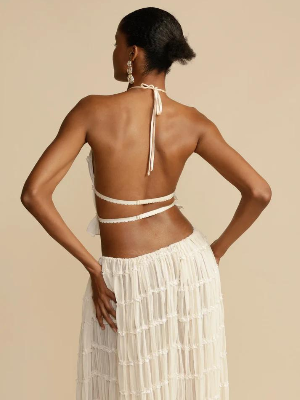 Questo set due pezzi in pizzo, composto da un top corto con scollo all’americana e una gonna lunga semi-trasparente, è perfetto per chi ama lo stile boho-chic con un tocco sofisticato. Il design leggero e il tessuto traforato creano un effetto delicato e romantico, ideale per vacanze, eventi estivi e cerimonie informali.