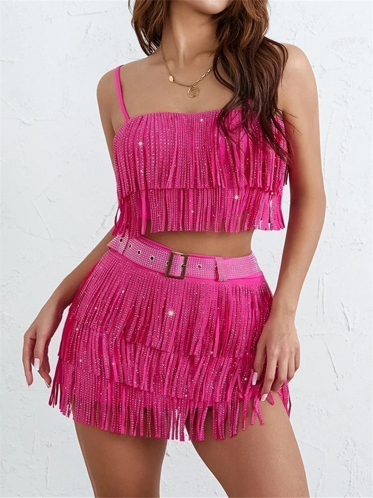 Questo set è composto da un top crop con spalline sottili e una mini gonna abbinata, entrambi decorati da frange lunghe impreziosite da paillettes che ondeggiano ad ogni passo. Il tessuto elasticizzato assicura una vestibilità aderente e confortevole, mentre la cintura tono su tono sulla gonna aggiunge un tocco strutturato e definito. Disponibile in diverse varianti colore — nero, bianco, fucsia — per adattarsi a ogni mood, dalla serata glam alla festa più scatenata.