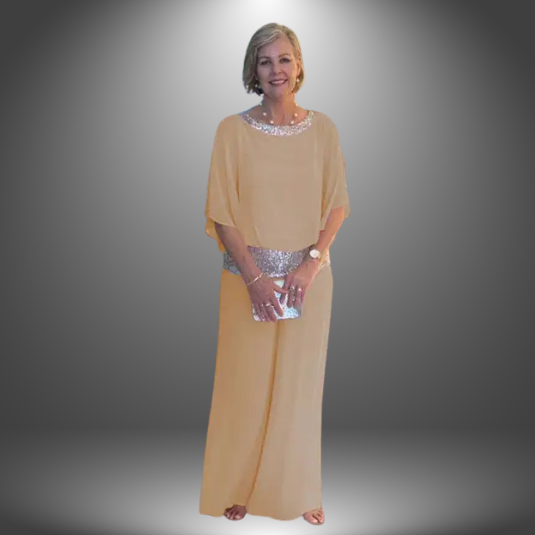 Il design fluido e i decori luminosi a collo e vita donano un tocco chic e sofisticato, ideale per una donna matura ed elegante.