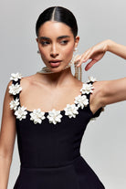 Il design svasato valorizza la silhouette, mentre le applicazioni floreali bianche donano un contrasto sofisticato, perfetto per cerimonie, cocktail e occasioni speciali.