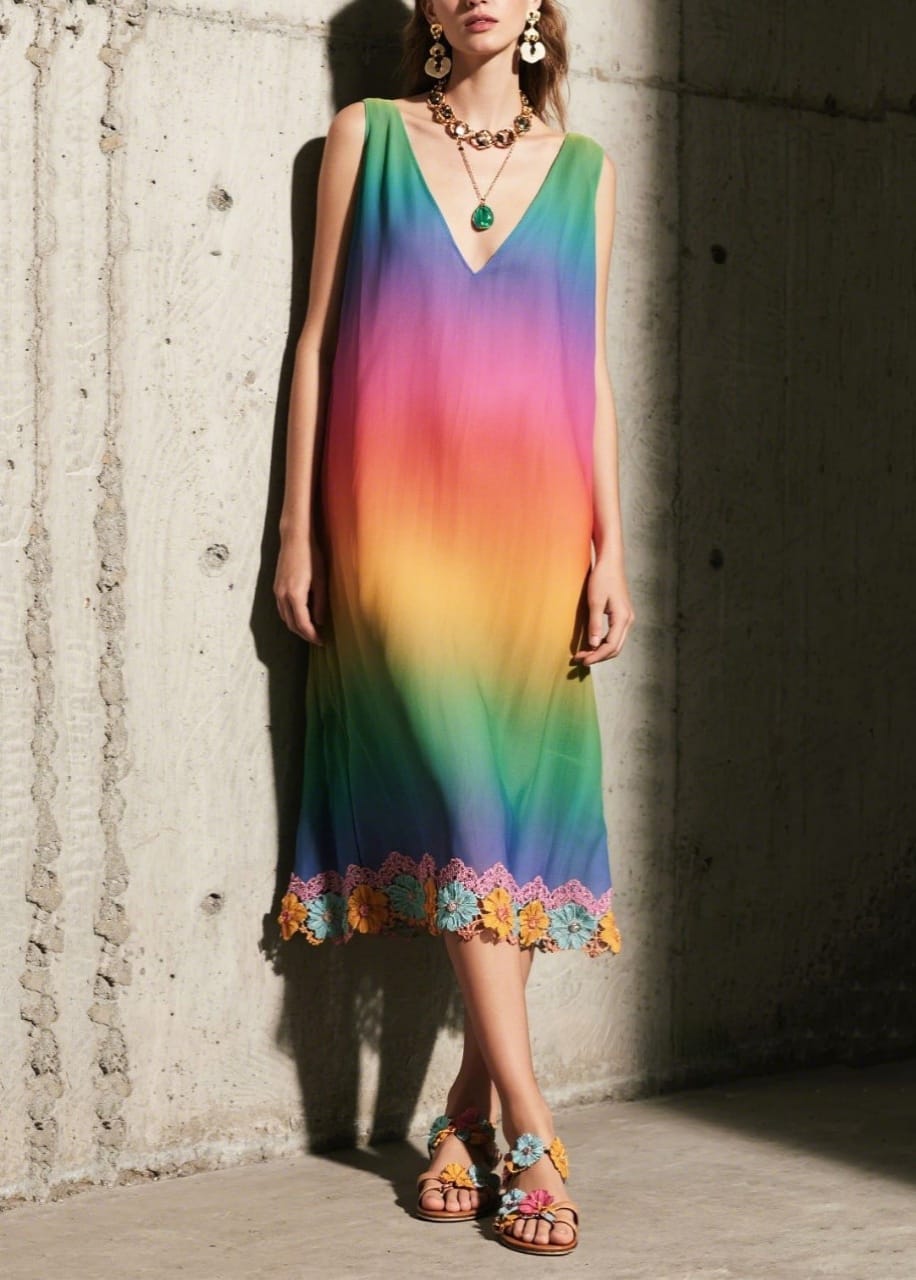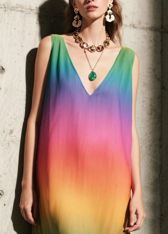 Questo vestito smanicato con sfumature arcobaleno è un’esplosione di energia e stile.